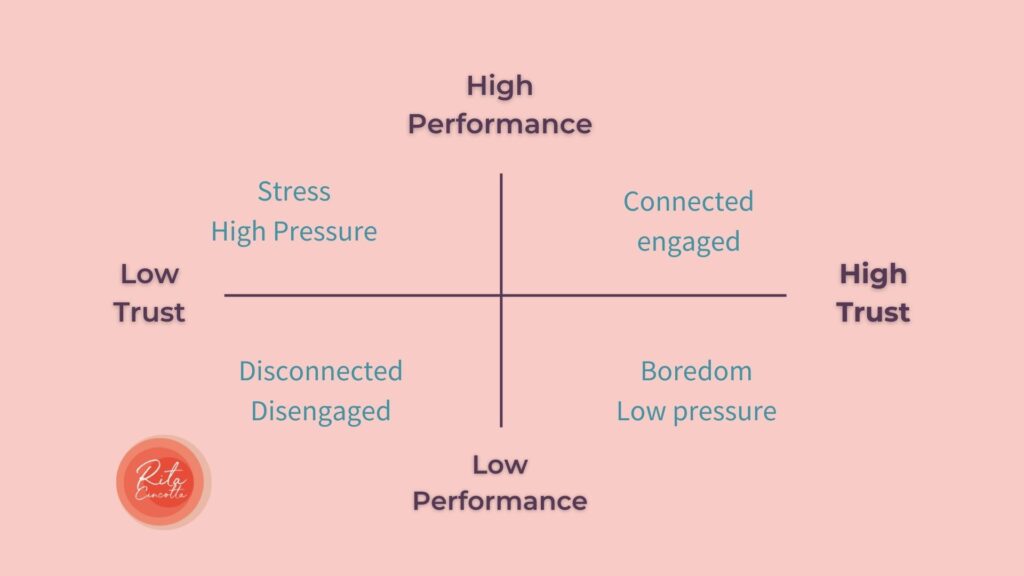 When we have high performance and high trust, we have connected and engaged teams. When we have low performance and low trust we have disconnected and disengaged teams. These two examples demonstrate the extremes of these axis. However, when we have low trust but an expectation and delivery of high performance, we are likely to have stress and high pressure. Here we need to be mindful of factors driving the behaviour. There might be issues around the presence or absence of psychological safety and the risk of burn out. When we have low performance and high trust, we may find that our teams experience boredom because of low pressure expectations. They have high trust that we will do our job, and therefore the performance pressure eases off.