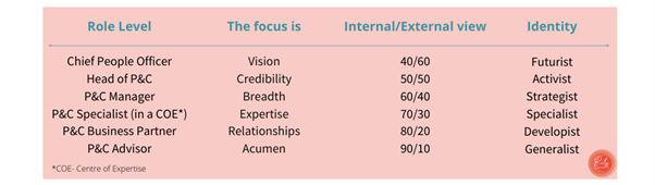 At the next level, the P&C Business Partner, our focus is on building relationships. We still have mainly an internal view, and the identity is associated with what we develop. We are responsive to stakeholders, and in partnering, we are developing solutions that are appropriate for their goals.